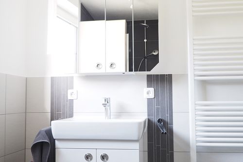 Massiver Waschtisch Unterschrank mit weiß lackierter Platte und Spiegelschrank